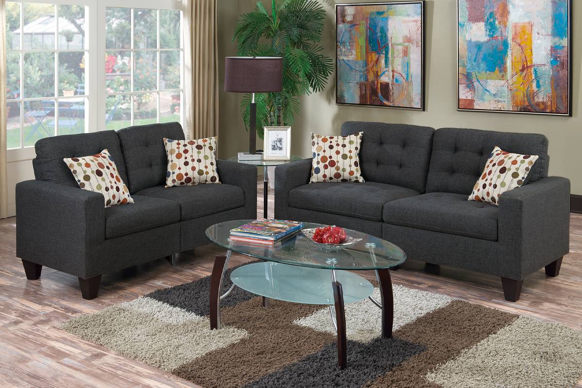 Come home to this 2-piece sofa set crafted in simplicity. Each piece is upholstered in a linen-like cushioned fabric with asymmetric tufting and light accent stitching. Adorn your seating with accent pillows for added flair.