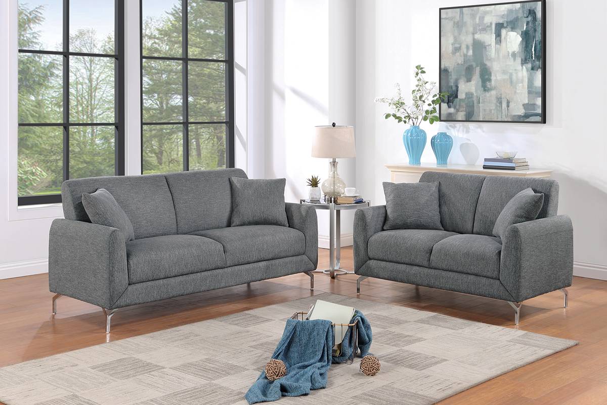 Upgrade your living room with this elegant and comfortable sofa loveseat set, featuring a harmonious blend of style and functionality. This cozy set is designed with a tight back and tight seat for maximum comfort and a clean, contemporary look. The triangle legs in a sleek chrome finish not only provide sturdy support but also add a chic flair to the overall design. The burlap-like fabric enhances the sofa loveseat's texture, bringing a warm and inviting feel to your home. The set comes complete with two matching throw pillows, adding a touch of sophistication to your seating arrangement.