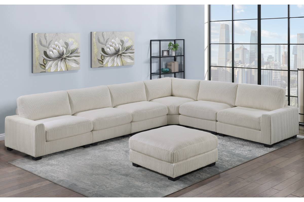 An attentively designed living space deserves a seating arrangement to match. With the flexibility of separate pieces, you can create almost any shape, letting you design your furniture to suit your living room needs. This compact modular sectional stands in low legs that are just barely visible giving it its modern look. It’s wrapped in super soft corduroy in a warm neutral hue that makes it even more inviting to family and friends.