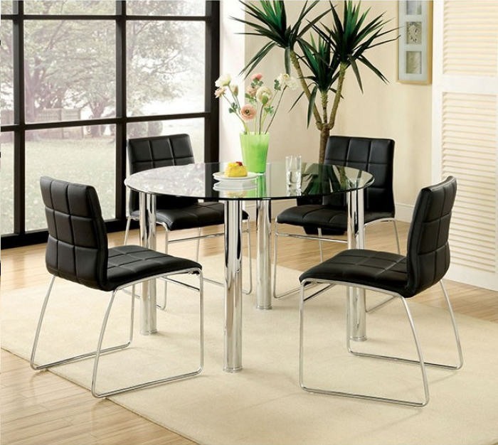Tempered glass top rests on four solid chrome posts, creating a sleek looking framework for a contemporary dining set. Black or white padded side chairs with thinner chrome legs provide contrast to the bold table legs and create visual interest. ( 12mm tempered glass top )