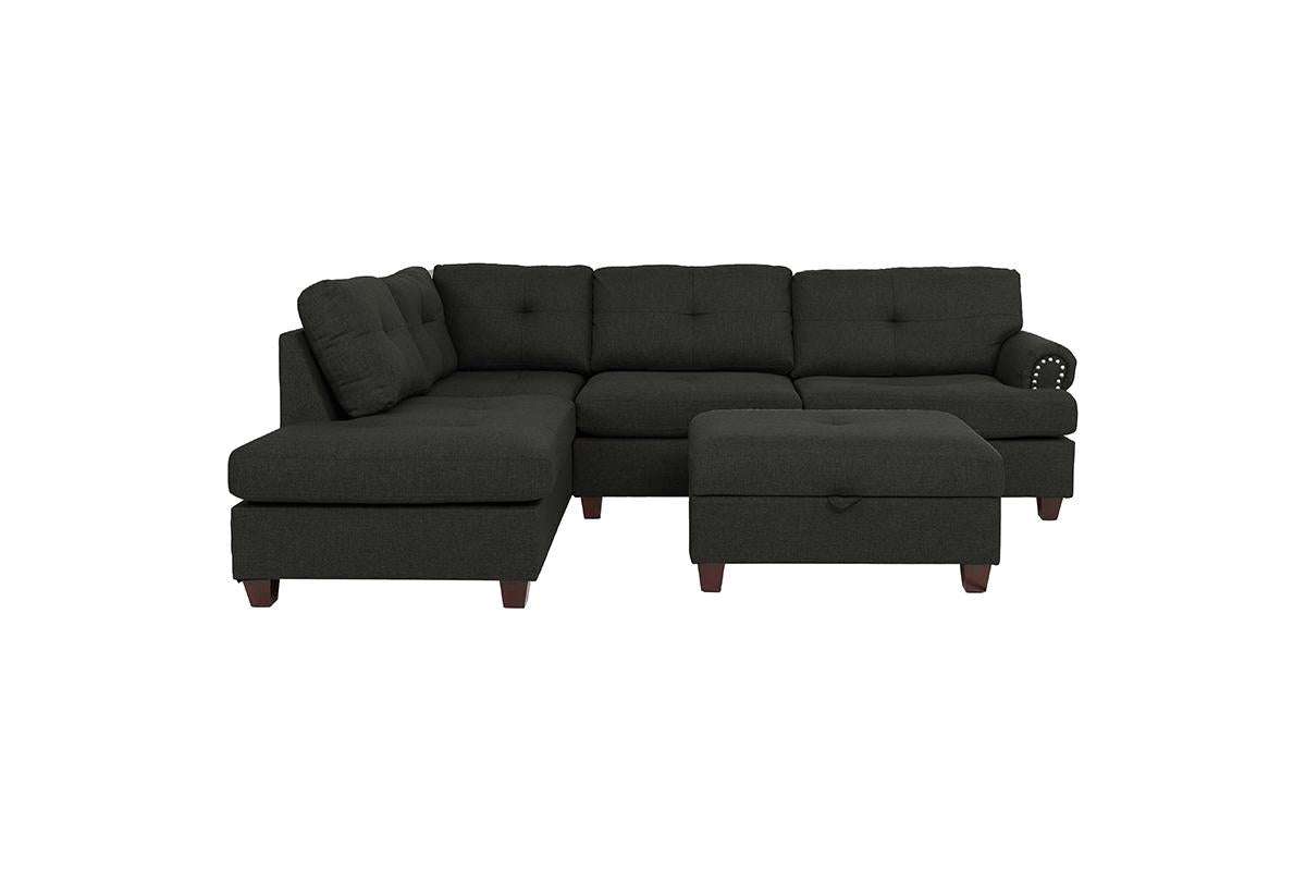 Achieve the perfect living room design with this 3-piece reversible sectional. Upholstered with simple stitching on the seat and back cushions, this unit works great with any contemporary designed living space. Other details include rolled armed with nickel-finished studding, an armless Reversible Chaise, Cocktail Storage Ottoman, and two accent pillows.