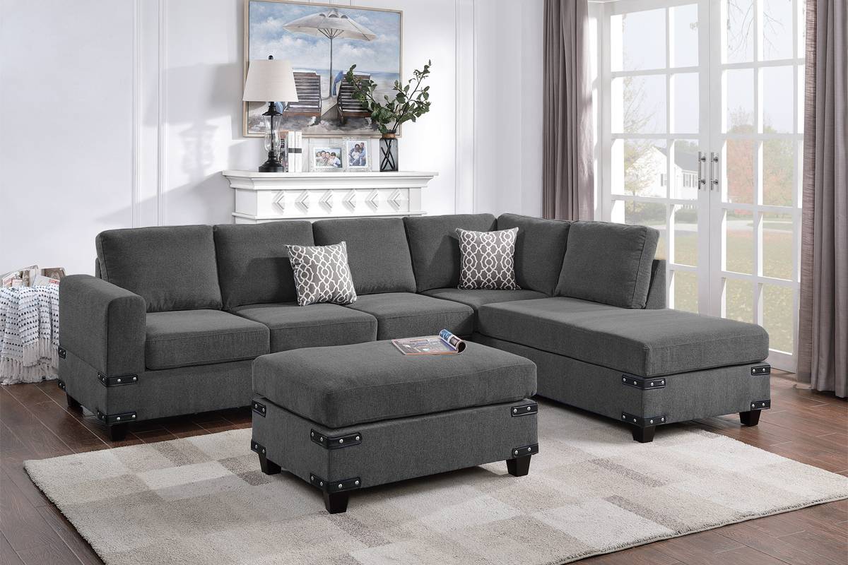 On the look for a spacious sofa set for your living room? This elegant three-piece sectional sofa set may be what you have in mind. Made with soft and durable fabric chenille that elevates comfort, the sofa set also has silver studs on the corner of each piece that add personality to your living space. The reversible chaise can also be arranged to your preference and your necessity. Adding the Cocktail Ottoman that provides extra space for your refreshments and magazines, how can you not fall in love with this piece of furniture?